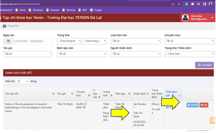 - Quá trình xử lý bài viết của Tác giả được thể hiện ở cột “Trạng thái”.