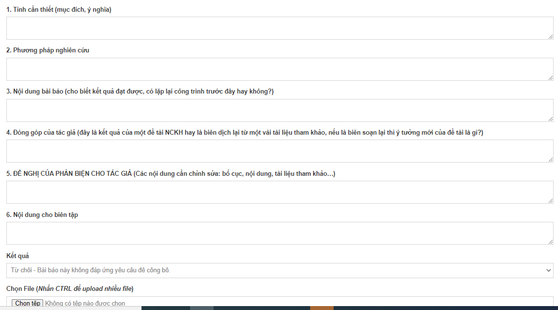 - Phản biện ghi các thông tin để trao đổi với tác giả vào giao diện trên và đính kèm file phản biện đã sửa (nếu có)